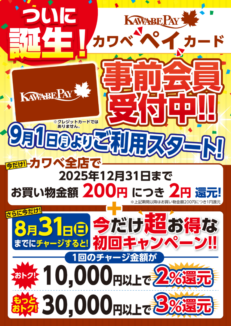 9月1日からカワベPayがスタートします! 初回キャンペーンとして、8月31日(日)までのお申し込みとチャージで、ポイント還元率は最大3%! 事前の会員登録は8月22日(金)より受付いたします。 ぜひこの機会にお申込みください。